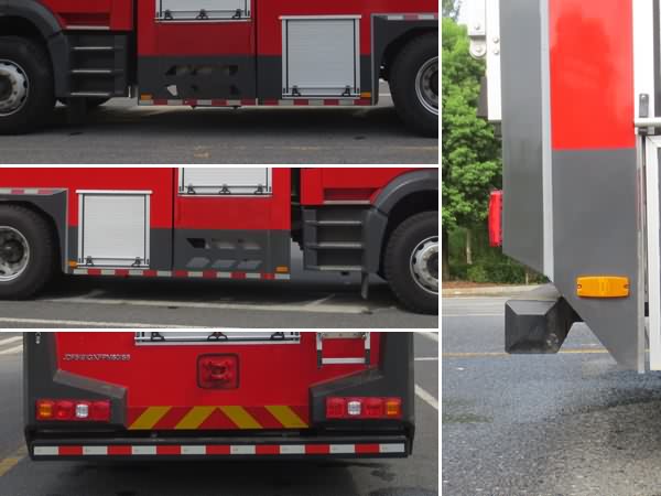罐體總?cè)莘e:8.0立方米,水罐容積:5.85立方米,水罐尺寸:1735×2440×1450mm,泡沫液罐容積:2.15立方米,泡沫液罐尺寸:635×2440×1450mm。整體式側(cè)防護(hù)結(jié)構(gòu),后防護(hù)裝置材料:Q235,截面尺寸:120×120mm,與車輛連接方式:螺栓連接,后防護(hù)離地高度:400mm。ABS系統(tǒng)生產(chǎn)廠家及型號(hào)為:西安正昌電子股份有限公司(型號(hào):ZQFB-V)。主要專用裝置有消防泵、消防炮。 | |||