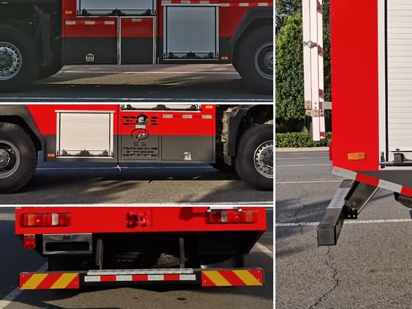 罐體總?cè)莘e:17.550立方米。水罐容積:15.250立方米,水罐尺寸:3970×2440×1650mm,泡沫液罐容積:2.300立方米,泡沫液罐尺寸:1110×1400×1550mm。整體式側(cè)防護結(jié)構(gòu),后防護裝置材料:Q235,截面尺寸:120×120mm,與車輛連接方式:螺栓連接,后防護離地高度:475mm,ABS生產(chǎn)企業(yè)為威伯科汽車**系統(tǒng)(**)有限公司,型號為4460046300。主要專用裝置有消防泵、消防炮。 | |||