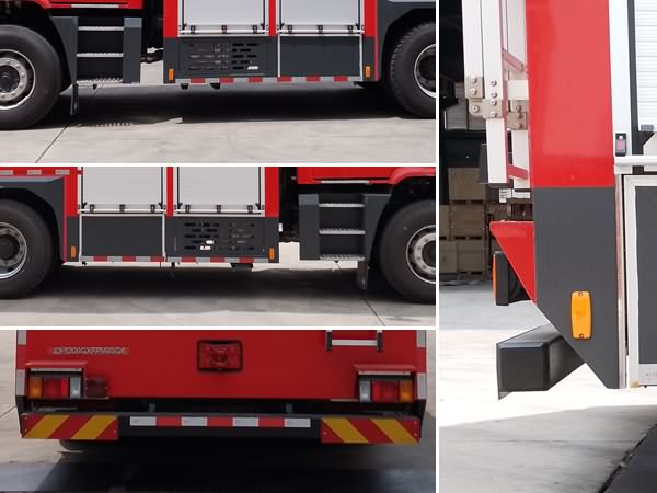 罐體總?cè)莘e為8.600立方米,水罐為“凸”字型罐,容積為6.550立方米,前端尺寸:1000×1500×1400mm,后端尺寸:1390×2440×1400mm,泡沫液罐容積為2.050立方米,泡沫液罐尺寸:1020×1500×1400mm。整體式側(cè)防護結(jié)構(gòu),后防護裝置材料:Q235,截面尺寸:120×120mm,與車輛連接方式:螺栓連接,后防護離地高度:410mm。ABS生產(chǎn)企業(yè)為浙江亞太機電股份有限公司,型號為APG3550500H1。主要專用裝置有消防泵、消防炮。 | |||