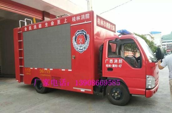 側面彩屏:采用P5 LED全彩屏,搭配17寸車載顯示器、工業(yè)**機(內存8G,硬盤1000G,鍵盤鼠標,U盤),視頻同步**系統(tǒng),配備不小于 150 瓦放大器及音箱,無線話筒,車載專用高品質音響*2臺可以播放存儲的典型案例、防火、初火撲救、地逃生自救等消防宣傳視頻,配合使用模擬滅火**演練系統(tǒng)。