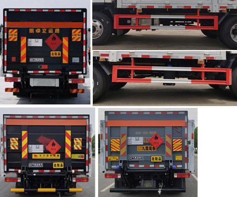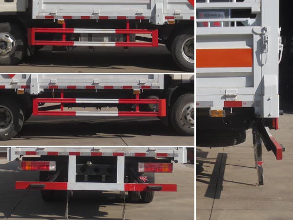 ABS防抱死制動系統(tǒng)生產(chǎn)廠家/型號:1.廣州瑞立科密汽車電子股份有限公司/CM4XL-4S/4M;2.浙江萬安科技股份有限公司/VIE ABS-II;安裝有限速裝置;限速裝置限速(km/h):80;安裝有具有衛(wèi)星定位功能的行駛記錄儀;隨底盤選裝駕駛室,選裝不同的后部燈具;隨底盤選裝底盤附件、燃油箱左右安裝位置;選裝廂體外觀,選裝無柵欄;選裝起重尾板(收起狀態(tài)水平長度為290mm),尾板質(zhì)量為450kg;選裝不同廠家尾板以及尾板外觀;該車選裝ETC車載裝置;發(fā)動機(jī)/油耗值(L/100km)對應(yīng)關(guān)系為:WP2.3NQ120E61/15.3,WP2.3NQ130E61/15.3,CA4DB1-13E6/13.38;側(cè)面防護(hù)及后下部防護(hù)裝置材料材質(zhì):Q235,側(cè)面防護(hù)連接方式:焊接連接;后下部防護(hù)裝置連接方式:焊接加螺栓連接,斷面尺寸(寬×高):45×100(mm),離地高度:460mm;選裝圓形后防護(hù),斷面尺寸(直徑):Φ110(mm),離地高度:420mm.運(yùn)輸**容器(瓶)包裝的貨物;危險貨物類項號:2.1,2.2;該車為危險品貨物運(yùn)輸車;僅采用前輪盤式制動器,前置排氣管,子午線輪胎;轉(zhuǎn)向輪安裝爆胎應(yīng)急防護(hù)裝置; | |||