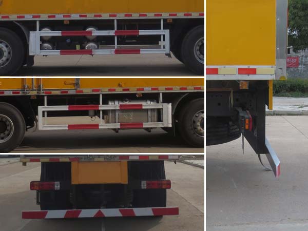 廂體頂部封閉,不可開啟;隨底盤選裝駕駛室;廂體側(cè)面選裝開門型式和位置;選裝瓦楞板結(jié)構(gòu)廂體;選裝后部雙拉桿結(jié)構(gòu);選裝起重尾板,尾板質(zhì)量為550kg;起重尾板收起狀態(tài)水平長度為290mm;該車選裝ETC車載裝置;運輸介質(zhì)類項號為:3;該車為危險品貨物運輸車;僅采用前輪盤式制動器,前置排氣管,子午線輪胎,限速裝置的底盤,限速80km/h;后軸為空氣懸架;轉(zhuǎn)向輪安裝爆胎應(yīng)急防護(hù)裝置;發(fā)動機(jī)/油耗申報值(L/100km)對應(yīng)關(guān)系為:YCK09400-60/37.6;該車安裝具有衛(wèi)星定位功能的行駛記錄儀;EBS型號/企業(yè): EBS3 /威伯科汽車**系統(tǒng)(**)有限公司;側(cè)面防護(hù)及后下部防護(hù)裝置材料材質(zhì):Q235,連接方式:焊接;后下部防護(hù)裝置斷面尺寸(寬×高):60×120(mm),離地高度:430mm;選裝起重尾板時,后防護(hù)結(jié)構(gòu)連接方式:焊接加螺栓連接,斷面尺寸(直徑):Φ120mm,離地高度:460mm. | |||