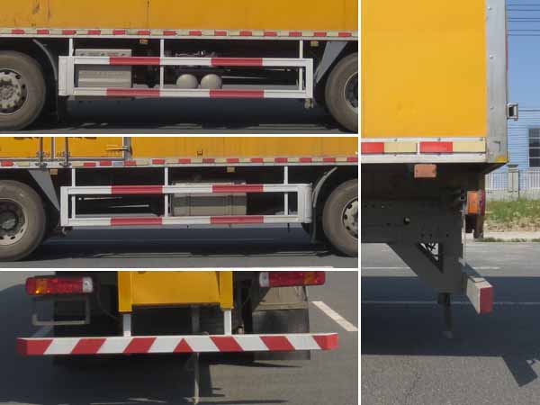 廂體頂部封閉,不可開啟;隨底盤選裝駕駛室;廂體側(cè)面選裝開門型式和位置;選裝瓦楞板機(jī)構(gòu)廂體以及開門型式和位置,選裝后部雙拉桿結(jié)構(gòu);選裝起重尾板,尾板質(zhì)量為550kg,起重尾板收起狀態(tài)水平長度為290mm;該車型可選裝ETC車載裝置;額定載質(zhì)量(kg)/整備質(zhì)量(kg)/準(zhǔn)乘人數(shù)(人)對(duì)應(yīng)關(guān)系為:20070/11800/2,20005/11800/3,20520/11350/2,20455/11350/3;運(yùn)輸**容器(瓶)包裝的貨物;危險(xiǎn)貨物類項(xiàng)號(hào):3;該車為危險(xiǎn)品貨物運(yùn)輸車;僅采用前輪盤式制動(dòng)器,前置排氣管,子午線輪胎,限速裝置的底盤,限速80km/h;后軸為空氣懸架;轉(zhuǎn)向輪安裝爆胎應(yīng)急防護(hù)裝置;發(fā)動(dòng)機(jī)/油耗申報(bào)值(L/100km)對(duì)應(yīng)關(guān)系為:MC07.31-60/38.0,MC07.34-60/38.0,MC09.35-60/38.0,MC09.38-60/38.0,MC09.35B-60/38.0,MC07H.35-60/38.0;該車安裝具有衛(wèi)星定位功能的行駛記錄儀;ABS系統(tǒng)**器生產(chǎn)企業(yè)/型號(hào)為威伯科(上海)管理有限公司/4460046300;選裝EBS,EBS系統(tǒng)**器生產(chǎn)企業(yè)/型號(hào)為威伯科(上海)管理有限公司/EBS3;側(cè)面防護(hù)及后下部防護(hù)裝置材料材質(zhì):Q235,連接方式:焊接;后下部防護(hù)裝置斷面尺寸(寬×高):60×120(mm),離地高度:460mm.選裝圓形后防護(hù),連接方式:焊接加螺栓連接;斷面尺寸(直徑):120(mm),離地高度:460mm. | |||
