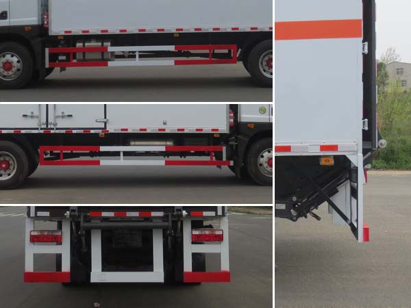 廂體頂部封閉,不可開啟;隨底盤選裝駕駛室;選裝燃油箱,電瓶,尿素罐,儲氣筒左右安裝位置.起重尾板為選裝件(收起狀態(tài)水平長度為290mm),尾板質(zhì)量為545kg;選裝不同廠家尾板及尾板樣式;廂體側(cè)面選裝開門型式和位置,選裝不帶側(cè)開門;選裝瓦楞板結(jié)構(gòu)廂體及開門型式和位置;選裝后部結(jié)構(gòu);額定載質(zhì)量/整備質(zhì)量(kg)對應(yīng)關(guān)系為:10700/7105,9995/7810;該車用于運輸具有**容器(瓶)包裝的危險品貨物類項號:3;僅采用前輪盤式制動器,前置排氣管,子午線輪胎,限速裝置的底盤,限速80km/h;后軸為空氣懸架;轉(zhuǎn)向輪安裝爆胎應(yīng)急防護(hù)裝置;發(fā)動機B6.2NS6B230,D4.5NS6B220,YCS04200-68,CY4SK761油耗申報值均為26.6L/100km;該車安裝具有衛(wèi)星定位功能的行駛記錄儀;EBS型號:EBS/ESC-d,生產(chǎn)企業(yè):襄陽東風(fēng)隆誠機械有限責(zé)任公司;側(cè)面防護(hù)及后下部防護(hù)裝置材料材質(zhì):Q235,連接方式:焊接加螺栓連接;后下部防護(hù)裝置斷面尺寸(寬×高):50×120(mm),離地高度:485mm.選裝圓形后防護(hù),斷面尺寸(直徑):Φ120(mm),離地高度:485mm.該車選裝ETC車載裝置. | |||
