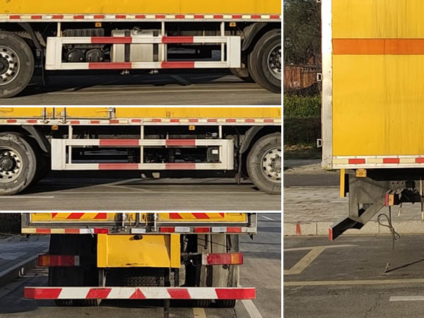 廂體頂部封閉,不可開啟;隨底盤選裝駕駛室,隨底盤選裝蓄電池及儲氣筒可選裝右置;選裝廂體開門型式及位置;選裝瓦楞板結(jié)構(gòu)廂體;選裝后部雙拉桿結(jié)構(gòu);選裝起重尾板,尾板質(zhì)量為550kg;起重尾板收起狀態(tài)水平長度為290mm;該車用于運輸具有**容器(瓶)包裝的危險貨物類項號為:9;僅采用前輪盤式制動器,前置排氣管,子午線輪胎,限速裝置的底盤,限速80km/h;后軸為空氣懸架;轉(zhuǎn)向輪安裝爆胎應(yīng)急防護(hù)裝置;該車選裝ETC車載裝置;發(fā)動機/油耗值(L/100km)對應(yīng)關(guān)系為:DDi75E350-60/38.1,L9NS6B400/38.2;該車安裝具有衛(wèi)星定位功能的行駛記錄儀;EBS型號/生產(chǎn)廠家:EBS5/東科克諾爾商用車制動系統(tǒng)(十堰)有限公司;側(cè)面防護(hù)及后下部防護(hù)裝置材料材質(zhì):Q235,連接方式:焊接連接;后下部防護(hù)裝置斷面尺寸(寬×高):60×120(mm),離地高度:495mm;選裝起重尾板時,后防護(hù)結(jié)構(gòu)連接方式:焊接加螺栓連接,斷面尺寸(直徑):Φ120mm,離地高度:460mm. | |||