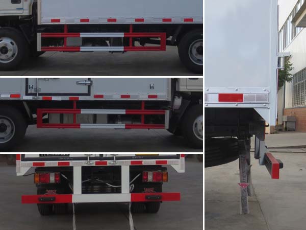 廂體頂部封閉,不可開啟;隨底盤選裝駕駛室;廂體側面選裝開門型式及位置,選裝不帶側開門,選裝瓦楞板結構;選裝起重尾板(收起狀態(tài)水平長度為280mm),尾板質量為350kg;運輸介質類項號為:9;該車為危險品貨物運輸車;僅采用前輪盤式制動器,前置排氣管,子午線輪胎,限速裝置的底盤,限速80km/h;轉向輪安裝爆胎應急防護裝置;發(fā)動機/油耗申報值(L/100km)對應關系為:JX4D30B6H/11.0,JX4D30A6H/11.1;該車安裝具有衛(wèi)星定位功能的行駛記錄儀;ABS系統型號:APG3550500A,ABS系統生產廠家:浙江亞太機電股份有限公司;側面防護及后下部防護裝置材料材質:Q235,連接方式:焊接加螺栓連接;后下部防護裝置斷面尺寸(寬×高):50×100(mm),離地高度:400mm;該車型可選裝ETC車載裝置. | |||