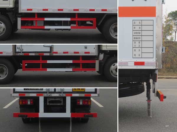廂體頂部封閉,不可開啟;廂體側(cè)面選裝開門型式及位置或不帶側(cè)開門;該車用于運(yùn)輸具有**容器(瓶)包裝的:黑火藥,壓縮黑火藥,電(非電)引爆雷管,爆破用,專用煙火制品,無煙火藥,糊狀火藥,爆破炸藥,導(dǎo)爆索,軟的,點(diǎn)燃導(dǎo)火索,射彈,帶有爆炸裝藥,聚能裝藥,不帶雷管,聚能炸藥,不帶雷管,非電引爆雷管組件,爆破用,油井用彈藥筒,固態(tài)推進(jìn)劑,動力裝置用彈藥筒,商品爆炸裝藥,不帶雷管,運(yùn)送爆炸品的項(xiàng)號:1.1 D,1.1 D,1.1B,1.1B,1.1G ,1.1C,1.3C,1.1 D,1.1 D,1.4G,1.1D,1.1 D,1.1B,1.1B,1.3C,1.1C,1.3C,1.1D;運(yùn)送危險貨物車輛的類型:EX/Ⅲ型車輛;僅采用前輪盤式制動器,前置排氣管,子午線輪胎,限速裝置的底盤,限速80km/h;轉(zhuǎn)向輪安裝爆胎應(yīng)急防護(hù)裝置;發(fā)動機(jī)/油耗申報值(L/100km)對應(yīng)關(guān)系為:JX4D30B6H/11.0,JX4D30A6H/11.1;該車安裝具有衛(wèi)星定位功能的行駛記錄儀;ABS系統(tǒng)型號:APG3550500A,ABS系統(tǒng)生產(chǎn)廠家:浙江亞太機(jī)電股份有限公司;側(cè)面防護(hù)及后下部防護(hù)裝置材料材質(zhì):Q235,連接方式:焊接加螺栓連接;后下部防護(hù)裝置斷面尺寸(寬×高):50×100(mm),離地高度:400mm. | |||