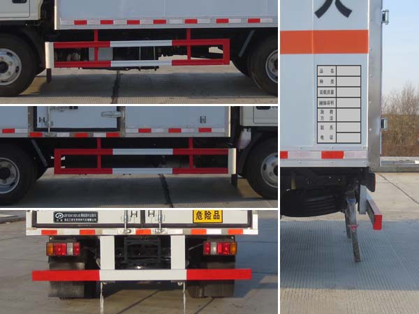 廂體頂部封閉,不可開(kāi)啟;廂體側(cè)面選裝開(kāi)門型式及位置或不帶側(cè)開(kāi)門;該車用于運(yùn)輸具有**容器(瓶)包裝的:黑火藥,壓縮黑火藥,電(非電)引爆雷管,爆破用,專用煙火制品,無(wú)煙火藥,糊狀火藥,爆破炸藥,導(dǎo)爆索,軟的,點(diǎn)燃導(dǎo)火索,射彈,帶有爆炸裝藥,聚能裝藥,不帶雷管,聚能炸藥,不帶雷管,非電引爆雷管組件,爆破用,油井用彈藥筒,固態(tài)推進(jìn)劑,動(dòng)力裝置用彈藥筒,商品爆炸裝藥,不帶雷管,運(yùn)送爆炸品的項(xiàng)號(hào):1.1 D,1.1 D,1.1B,1.1B,1.1G ,1.1C,1.3C,1.1 D,1.1 D,1.4G,1.1D,1.1 D,1.1B,1.1B,1.3C,1.1C,1.3C,1.1D;運(yùn)送危險(xiǎn)貨物車輛的類型:EX/Ⅱ型車輛;僅采用前輪盤式制動(dòng)器,前置排氣管,子午線輪胎,限速裝置的底盤,限速80km/h;轉(zhuǎn)向輪安裝爆胎應(yīng)急防護(hù)裝置;發(fā)動(dòng)機(jī)與油耗申報(bào)值(L/100km)對(duì)應(yīng)關(guān)系為:JX4D30B6H/11.1,JX4D30A6H/11.4,JX4D30C6H/11.4;該車安裝具有衛(wèi)星定位功能的行駛記錄儀;液剎ABS系統(tǒng)型號(hào):APG3550500A,ABS系統(tǒng)生產(chǎn)廠家:浙江亞太機(jī)電股份有限公司;氣剎ABS系統(tǒng)型號(hào): VIE ABS-II,ABS系統(tǒng)生產(chǎn)廠家: 浙江萬(wàn)安科技股份有限公司;側(cè)面防護(hù)及后下部防護(hù)裝置材料材質(zhì):Q235,連接方式:焊接加螺栓連接;后下部防護(hù)裝置斷面尺寸(寬×高):50×100(mm),離地高度:460mm. | |||