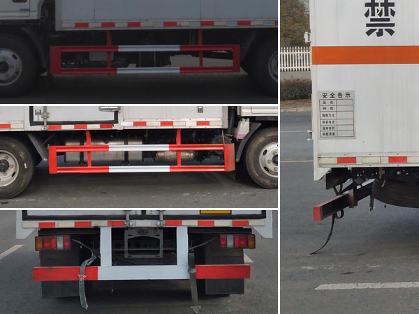 廂體頂部封閉,不可開啟;廂體側(cè)面選裝開門型式和位置,選裝不帶側(cè)開門;該車型可選裝ETC車載裝置;該車用于運(yùn)輸具有**容器(瓶)包裝的危險貨物類項號:1.1 D,1.1B,1.1G ,1.1C,1.3C,1.4G;運(yùn)送危險貨物車輛的類型:EX/Ⅲ型車輛;僅采用前輪盤式制動器,前置排氣管,子午線輪胎,限速裝置的底盤,限速80km/h;轉(zhuǎn)向輪安裝爆胎應(yīng)急防護(hù)裝置;發(fā)動機(jī)與油耗申報值(L/100km)對應(yīng)關(guān)系為:JX4D30A6H/12.2,JX4D30B6H/12.8,JX493ZLQ6A/12.8;該車安裝具有衛(wèi)星定位功能的行駛記錄儀;液剎ABS系統(tǒng)型號:APG3550500A,ABS系統(tǒng)生產(chǎn)廠家:浙江亞太機(jī)電股份有限公司;氣剎ABS系統(tǒng)型號: VIE ABS-II,ABS系統(tǒng)生產(chǎn)廠家: 浙江萬安科技股份有限公司;ABS系統(tǒng)型號:3550B500,ABS系統(tǒng)生產(chǎn)廠家:浙江亞太機(jī)電股份有限公司;側(cè)面防護(hù)及后下部防護(hù)裝置材料材質(zhì):Q235,側(cè)面防護(hù)連接方式:焊接連接;后下部防護(hù)裝置連接方式:焊接加螺栓連接,斷面尺寸(寬×高):50×100(mm),離地高度:420mm. | |||