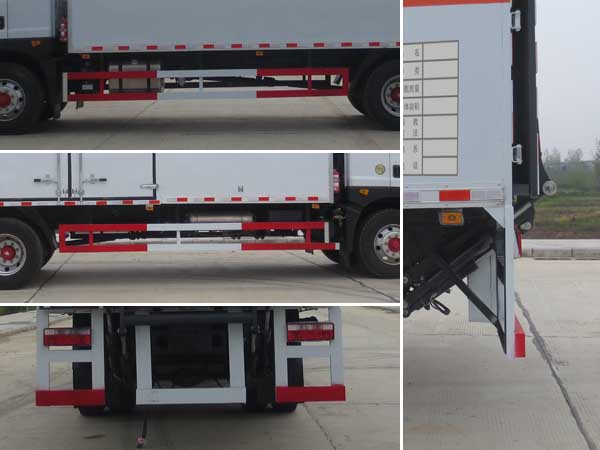 廂體頂部封閉,不可開(kāi)啟;隨底盤(pán)選裝駕駛室;選裝燃油箱,電瓶,尿素罐,儲(chǔ)氣筒左右安裝位置,選裝鋁合金油箱;該車(chē)型可選裝ETC車(chē)載裝置;起重尾板為選裝件(收起狀態(tài)水平長(zhǎng)度為290mm),尾板質(zhì)量為545kg;廂體側(cè)面選裝開(kāi)門(mén)型式和位置,選裝不帶側(cè)開(kāi)門(mén);額定載質(zhì)量/整備質(zhì)量(kg)對(duì)應(yīng)關(guān)系為:10700/7105,9995/7810;該車(chē)用于運(yùn)輸具有**容器(瓶)包裝的危險(xiǎn)品貨物類(lèi)項(xiàng)號(hào):1.1 D,1.1B,1.1G ,1.1C,1.3C,1.4G;運(yùn)送危險(xiǎn)貨物車(chē)輛的類(lèi)型:EX/Ⅲ型車(chē)輛;僅采用前輪盤(pán)式制動(dòng)器,前置排氣管,子午線輪胎,限速裝置的底盤(pán),限速80km/h;后軸為空氣懸架;轉(zhuǎn)向輪安裝爆胎應(yīng)急防護(hù)裝置;發(fā)動(dòng)機(jī)B6.2NS6B230,D4.5NS6B220,YCS04200-68,CY4SK761油耗申報(bào)值均為26.6L/100km;該車(chē)安裝具有衛(wèi)星定位功能的行駛記錄儀;EBS系統(tǒng)生產(chǎn)廠家,型號(hào):襄陽(yáng)東風(fēng)隆誠(chéng)機(jī)械有限責(zé)任公司,EBS/ESC-d;側(cè)面防護(hù)及后下部防護(hù)裝置材料材質(zhì):Q235,連接方式:焊接加螺栓連接;后下部防護(hù)裝置斷面尺寸(寬×高):50×120(mm),離地高度:485mm. | |||