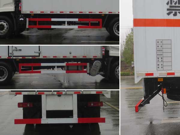 廂體頂部封閉,不可開啟;隨底盤選裝駕駛室,選裝后處理隔熱罩;廂體側面選裝開門型式及位置或不帶側開門;用于運輸具有**容器(瓶)包裝的:黑火藥,壓縮黑火藥,電(非電)引爆雷管,爆破用,專用煙火制品,無煙火藥,糊狀火藥,爆破炸藥,導爆索,軟的,點燃導火索,射彈,帶有爆炸裝藥,聚能裝藥,不帶雷管,聚能炸藥,不帶雷管,非電引爆雷管組件,爆破用,油井用彈藥筒,固態(tài)推進劑,動力裝置用彈藥筒,商品爆炸裝藥,不帶雷管.運送爆炸品的項號:1.1 D,1.1 D,1.1B,1.1B,1.1G ,1.1C,1.3C,1.1 D,1.1 D,1.4G,1.1D,1.1 D,1.1B,1.1B,1.3C,1.1C,1.3C,1.1D;運送危險貨物車輛的類型:EX/Ⅲ型車輛;僅采用前輪盤式制動器,前置排氣管,子午線輪胎,限速裝置的底盤,限速80km/h;轉向輪安裝爆胎應急防護裝置;后軸采用空氣懸架;發(fā)動機/油耗申報值(L/100km)對應關系為:B6.2NS6B210/25.9,DDi50E190-60/25.9;該車安裝具有衛(wèi)星定位功能的行駛記錄儀;EBS型號/生產(chǎn)廠家:EBS5/東科克諾爾商用車制動系統(tǒng)(十堰)有限公司;側面防護及后下部防護裝置材料材質:Q235,連接方式:焊接加螺栓連接;后下部防護裝置斷面尺寸(寬×高):50×120(mm),離地高度:495mm. | |||