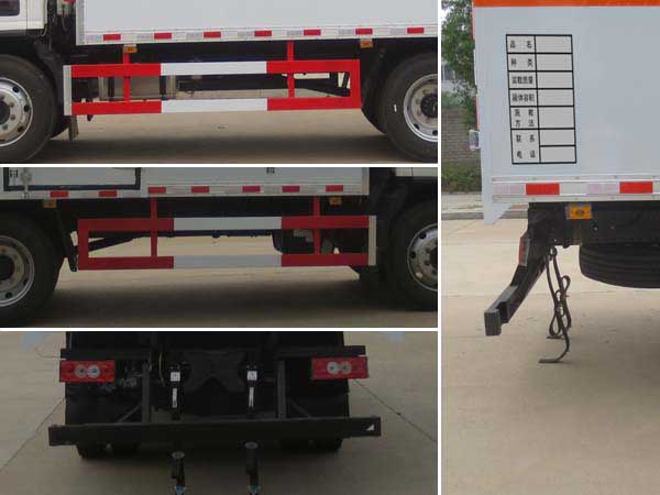 廂體頂部封閉,不可開啟;隨底盤選裝駕駛室,選裝儲氣筒內(nèi)置;廂體側(cè)面選裝開門型式及位置或不帶側(cè)開門;運輸介質(zhì)類項號為:1.1,1.3,1.4;運送危險貨物車輛的類型:EX/Ⅲ型車輛;僅采用前輪盤式制動器,前置排氣管,子午線輪胎,限速裝置的底盤,限速80km/h;轉(zhuǎn)向輪安裝爆胎應急防護裝置;發(fā)動機/油耗申報值(L/100km)對應關系為:F3.8NS6B156/21.02,D30TCIF1/20.39;該車安裝具有衛(wèi)星定位功能的行駛記錄儀;ABS系統(tǒng)型號:ABS-VI.E;生產(chǎn)企業(yè):廣州瑞立科密汽車電子股份有限公司.ABS系統(tǒng)型號:ABS-E;生產(chǎn)企業(yè):威伯科汽車**系統(tǒng)(**)有限公司;側(cè)面防護及后下部防護裝置材料材質(zhì):Q235,連接方式:焊接加螺栓連接;后下部防護裝置斷面尺寸(寬×高):50×100(mm),離地高度:420mm. | |||