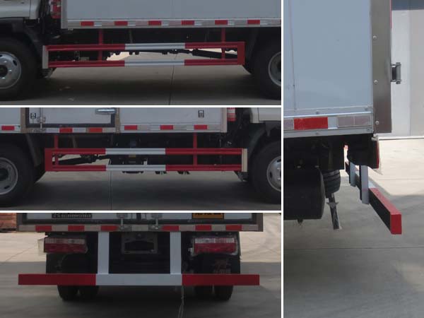 廂體頂部封閉,不可開啟;隨底盤選裝尾燈樣式;廂體側面選裝開門型式及位置,選裝不帶側開門,選裝瓦楞板結構;選裝起重尾板(收起狀態(tài)水平長度為280mm),尾板質量為350kg;運輸介質類項號為:2.1,2.2;該車為危險品貨物運輸車;僅采用前輪盤式制動器,前置排氣管,子午線輪胎,限速裝置的底盤,限速80km/h;轉向輪安裝爆胎應急防護裝置;發(fā)動機WP2.3NQ130E61對應油耗申報值為11.3L/100km;該車安裝具有衛(wèi)星定位功能的行駛記錄儀ABS型號/廠家為:CM4XL-4S/4M /廣州瑞立科密汽車電子股份有限公司,ABS型號/廠家:VIE ABS-Ⅱ/浙江萬安科技股份有限公司;側面防護及后下部防護裝置材料材質:Q235,連接方式:焊接加螺栓連接;后下部防護裝置斷面尺寸(寬×高):50×100(mm),離地高度:450mm;裝起重尾板時,選裝圓形后防護,斷面尺寸(直徑):Φ110(mm),離地高度:400mm;該車可選裝ETC車載裝置. | |||