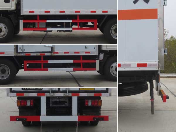 廂體頂部封閉,不可開(kāi)啟;隨底盤(pán)選裝駕駛室;隨底盤(pán)選裝尿素箱安裝位置、油箱安裝位置;廂體選裝瓦楞板結(jié)構(gòu),廂體側(cè)面選裝開(kāi)門(mén)型式及位置或不帶側(cè)開(kāi)門(mén),選裝百葉窗;選裝起重尾板(收起狀態(tài)水平長(zhǎng)度為280mm),尾板質(zhì)量為350kg,選裝不同廠家尾板及尾板樣式;運(yùn)輸介質(zhì)類(lèi)項(xiàng)號(hào)為:2.1,2.2;該車(chē)為危險(xiǎn)品貨物運(yùn)輸車(chē);僅采用前輪盤(pán)式制動(dòng)器,前置排氣管,子午線輪胎,限速裝置的底盤(pán),限速80km/h;轉(zhuǎn)向輪安裝爆胎應(yīng)急防護(hù)裝置;發(fā)動(dòng)機(jī)/油耗申報(bào)值(L/100km)對(duì)應(yīng)關(guān)系為:JX4D30B6H/11.0,JX4D30A6H/11.1,JX493ZLQ6D/10.9;該車(chē)安裝具有衛(wèi)星定位功能的行駛記錄儀;ABS系統(tǒng)型號(hào):APG3550500A,ABS系統(tǒng)生產(chǎn)廠家:浙江亞太機(jī)電股份有限公司;選裝ABS系統(tǒng)型號(hào):3550B500,ABS系統(tǒng)生產(chǎn)廠家:浙江亞太機(jī)電股份有限公司;選裝ABS系統(tǒng)型號(hào):VIE ABS-II,ABS系統(tǒng)生產(chǎn)廠家:浙江萬(wàn)安科技股份有限公司;側(cè)面防護(hù)及后下部防護(hù)裝置材料材質(zhì):Q235,連接方式:焊接加螺栓連接;后下部防護(hù)裝置斷面尺寸(寬×高):50×100(mm),離地高度:400mm;選裝圓形后防護(hù)時(shí),連接方式:焊接加螺栓連接;后下部防護(hù)裝置斷面尺寸(直徑):Φ110(mm),離地高度:400mm;該車(chē)型可選裝ETC車(chē)載裝置. | |||