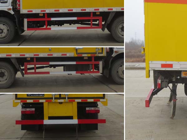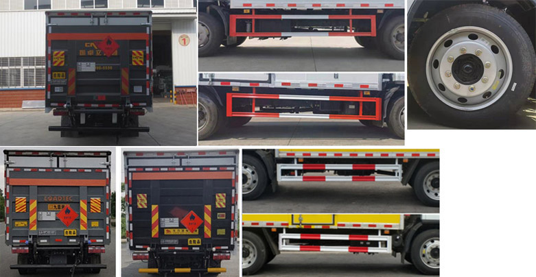 廂體頂部封閉,不可開啟;隨底盤選裝駕駛室,選裝輪輞樣式,選裝燃油箱,電瓶,尿素罐,儲氣筒左右安裝位置;選裝起重尾板(收起狀態(tài)水平長度為290mm),尾板質(zhì)量為450kg;選裝不同廠家尾板以及尾板外觀;廂體選裝瓦楞板結構,廂體側面選裝開門型式及位置或不帶側開門,選裝百葉窗;僅采用底盤3800mm軸距;運輸介質(zhì)類項號為:2.1,2.2;該車為危險品貨物運輸車;僅采用前輪盤式制動器,前置排氣管,子午線輪胎,限速裝置的底盤,限速80km/h;轉(zhuǎn)向輪安裝爆胎應急防護裝置;發(fā)動機YCS04190-68,D25TCIF1,D30TCIF1,D40TCIF1,NV30-C6D,CY4SK261,CY4SK361,YCY30165-60對應油耗申報值均為:21.3L/100km;該車安裝具有衛(wèi)星定位功能的行駛記錄儀;ABS型號/廠家:ABS型號:ABS/ASR-24V-4S/4M,廠家:襄陽東風隆誠機械有限責任公司;側面防護及后下部防護裝置材料材質(zhì):Q235,連接方式:焊接加螺栓連接;后下部防護裝置斷面尺寸(寬×高):45×100(mm),離地高度:460mm;選裝圓形后防護,連接方式:焊接加螺栓連接;后下部防護裝置斷面尺寸為:Φ110mm,離地高度:400mm;該車型可選裝ETC車載裝置. | |||